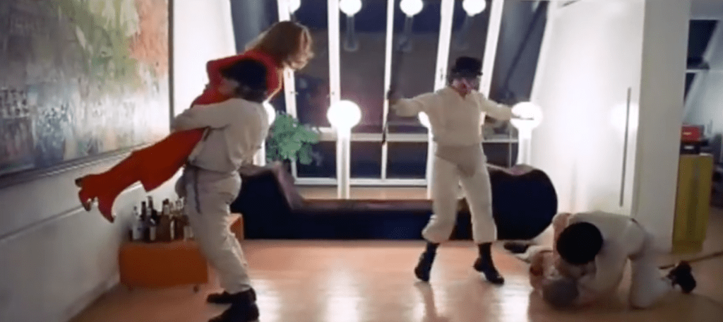 A chillng singing scene from Kubrick’s A clockwork orange with Malcolm McDowell, now 79