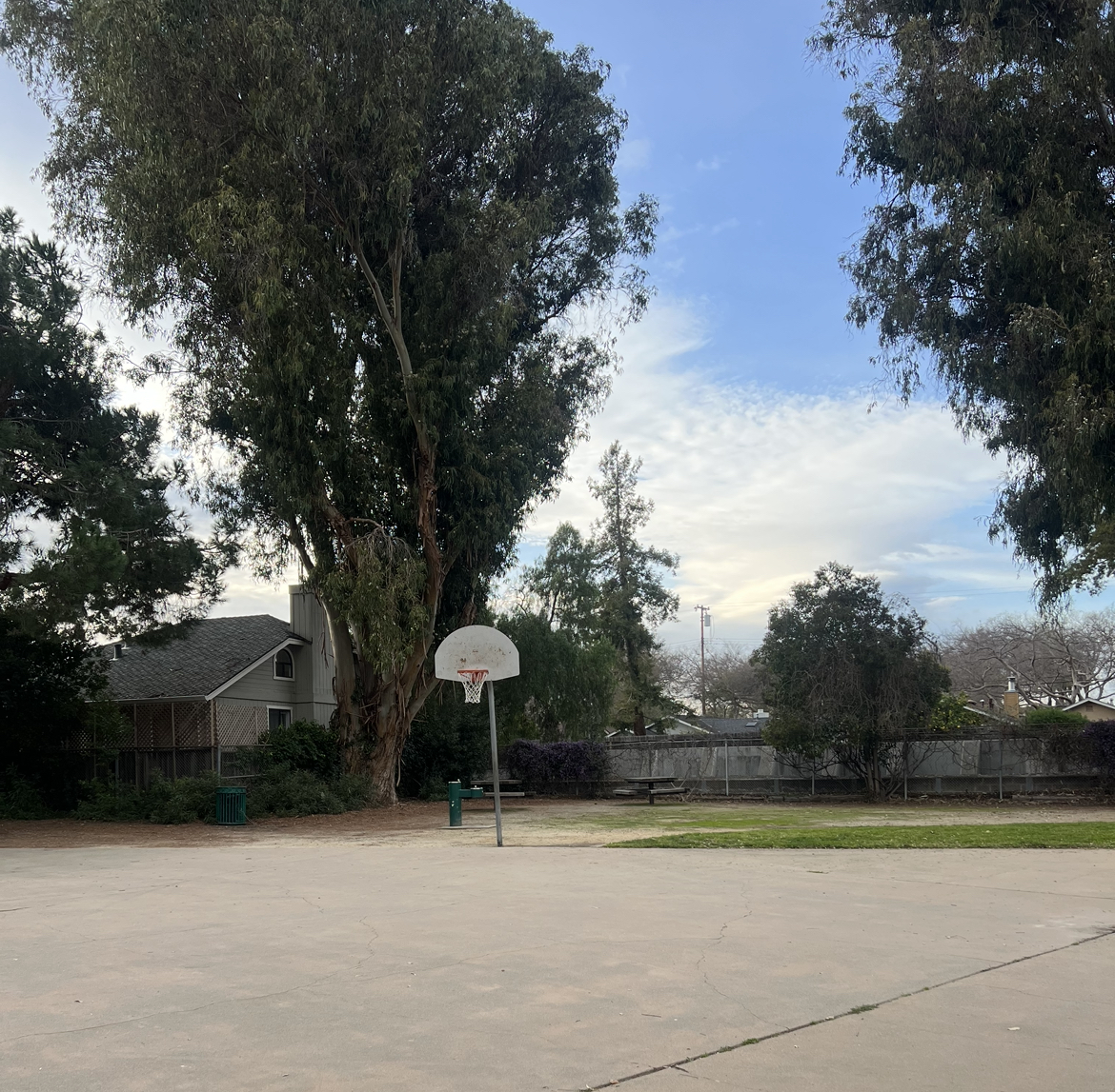 Here is a photo of the basketball court at Henry W. Seale Park (formerly known as Stockton Park) in Palo Alto. The PAHA calls it a “multipurpose bowl with basketball hoop.” It is quite near to 3134 Greer, where Kent lived from 7th grade on, and where he and Jerry Chang, and Mark House, famously (at least, according to Kristin Huckshorn of the San Jose Mercury News) would in the driveway bounce the basketball for hours on end, and where, not entirely incidentally, Lockhart helped his mother Marlinda Fitzgerald design and install a very unique surviving garden, itself fit for either PAPAC attention or Steve Staiger’s files as an arts landmark. Kent later said that carrying and placing the 50-pound boulders, which supposedly came from San Simeon with the direct permission of William Randolph Hearst, was equivalent to putting in that many hours in the weight room. When they weren’t in the drive way, they were often around the corner at the single hoop at Seale Park; Kent and I re-lived those days in a shootaround in 1988, the year he was MVP of the SF Pro Am league that also featured NBA’s Scooter Barry and Lester Conner.