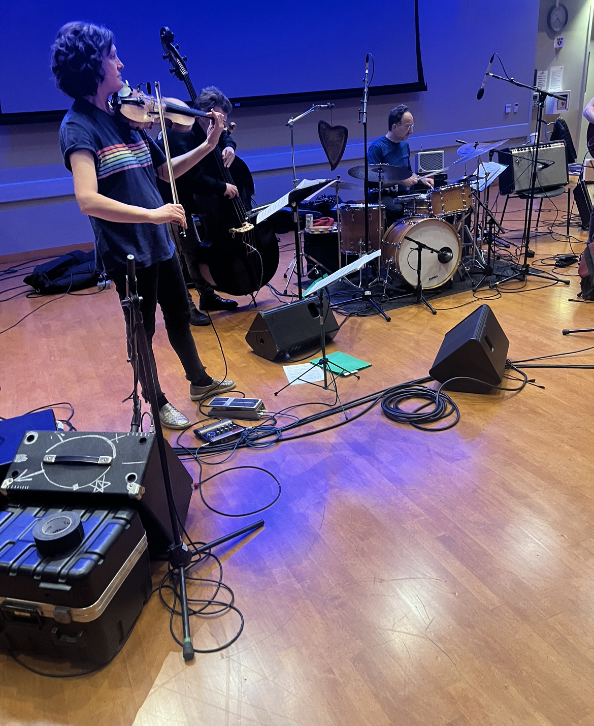 Jenny Scheinman, violin, Todd Sickafoose, bass, Scott Amendola, drums and effects, performing as Damn Skippy, Mitchell Park Community, March 4, 2023: soundcheck