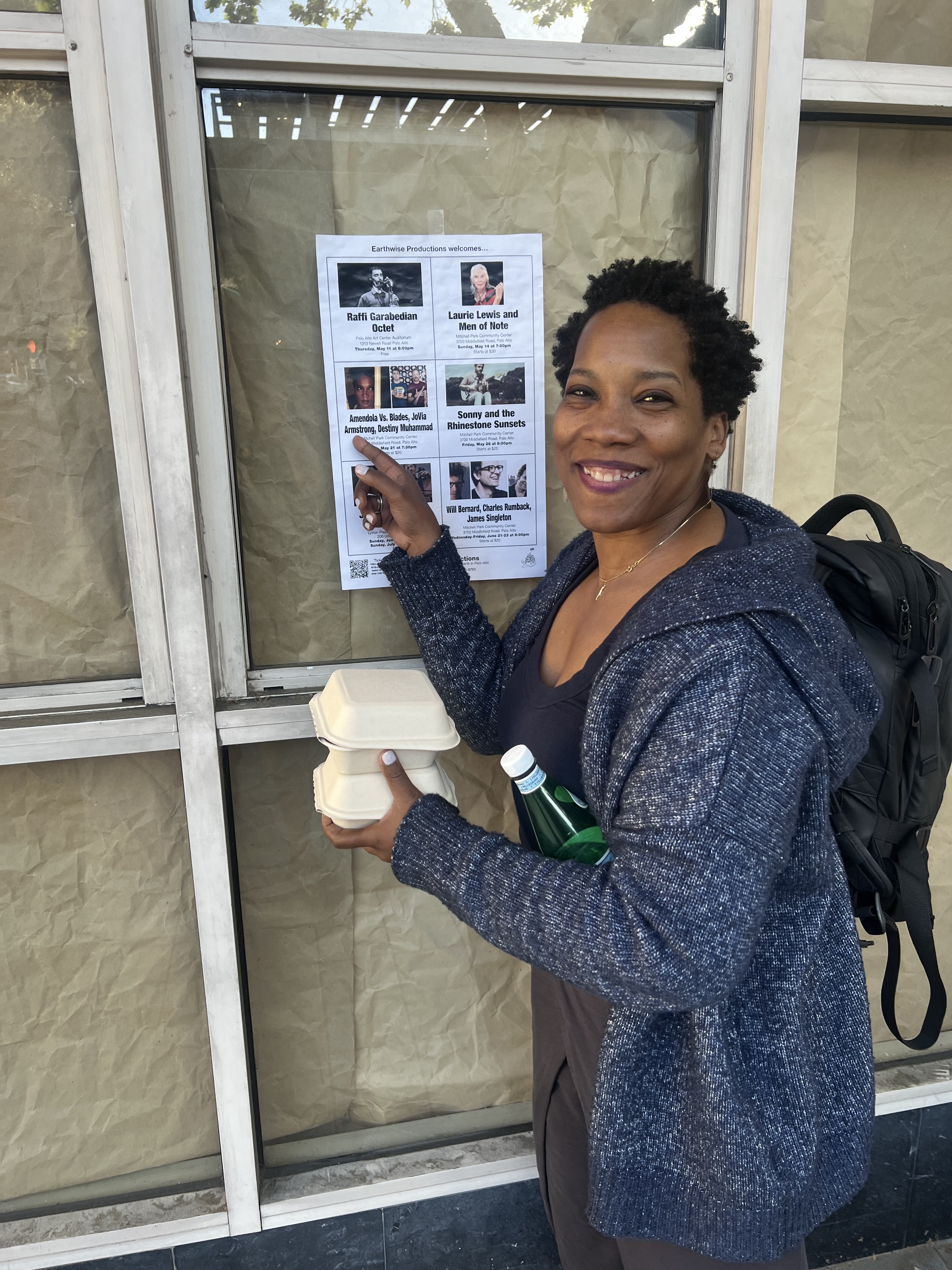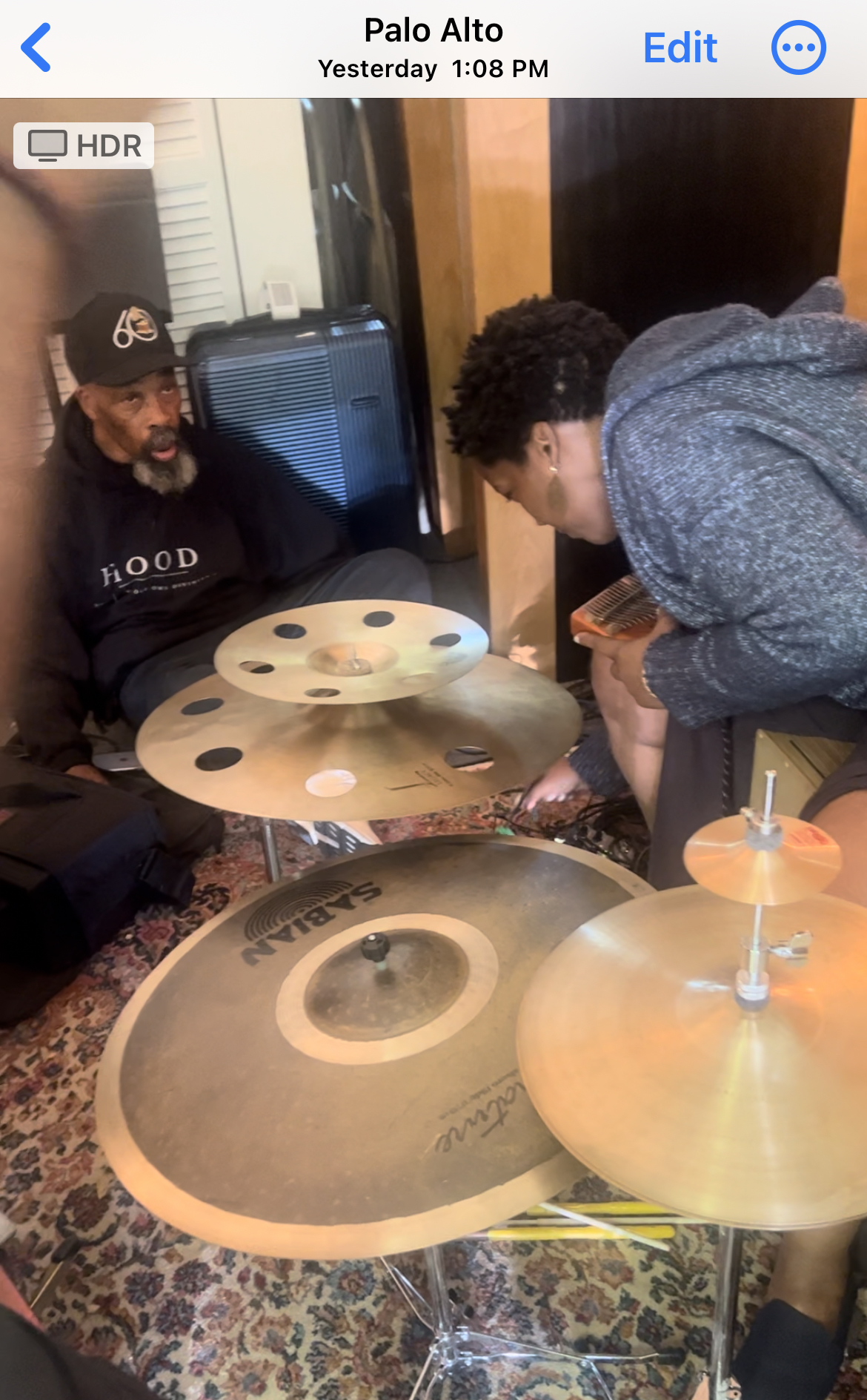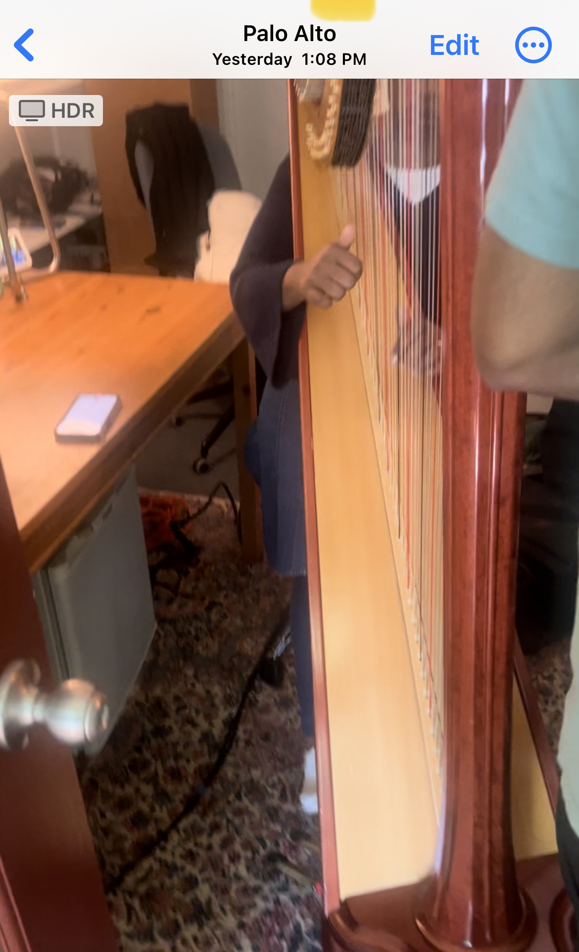 JoVia suggested the collaboration with Destiny Muhammad, an LA native who has made the East Bay her base for many years. Destiny cut her teeth as a busking harpist at farmers’ markets. She told me she bought her harp — she calls Paloma – from Gryphon Stringed here in Palo Alto.