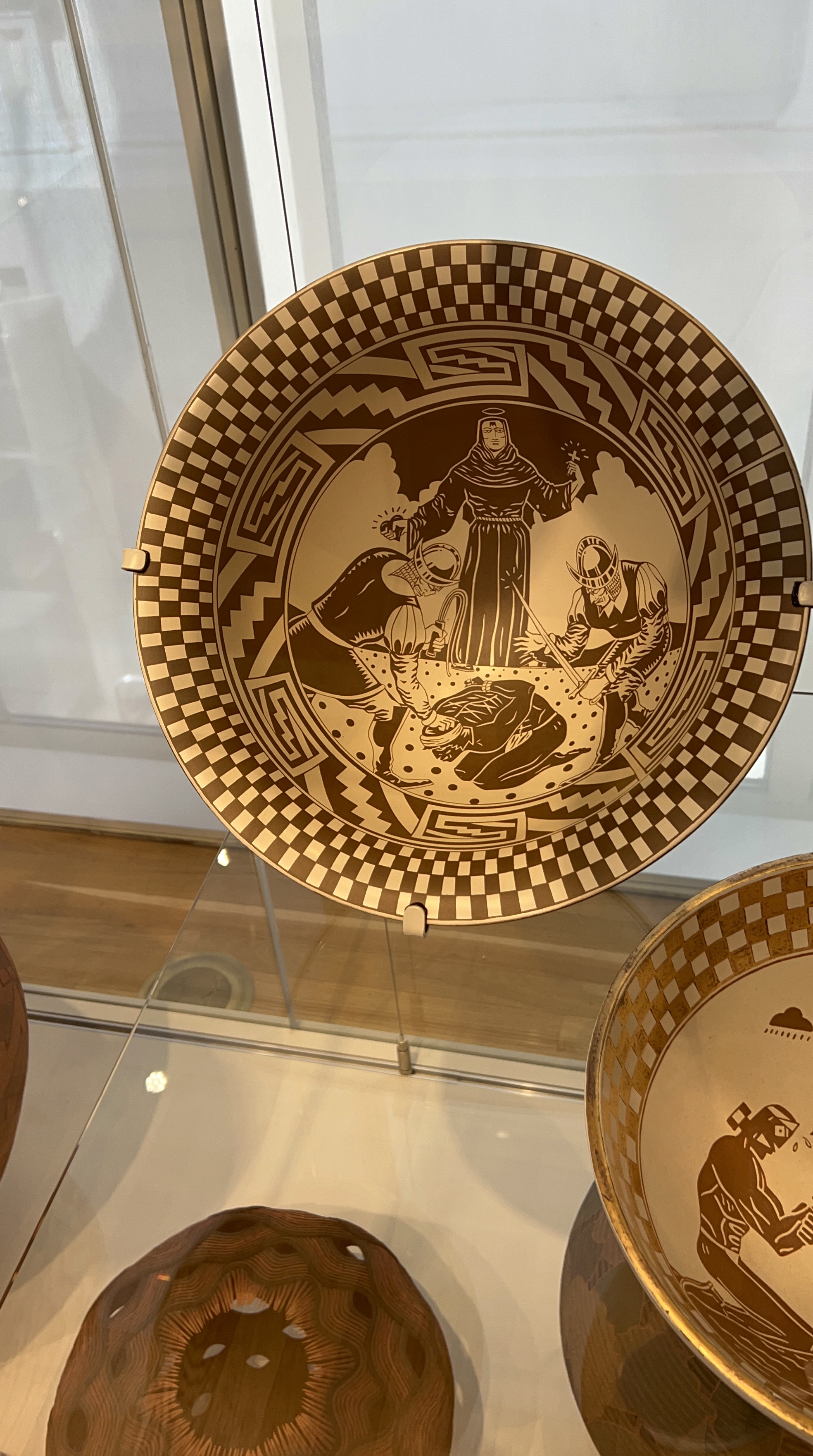 Diego Romero lived in Berkeley for much of his youth before moving to Santa Fe area where he creates pottery with iconography that references the history of his group, the Cochiti. He is an ongoing “pueblo revolt”. I took this picture recently in Sacramento, CA at the Crocker Museum. His works, donated by a Mr or Dr Lipson are near pots by various Pueblo artists and styles donated by my siblings and parents.