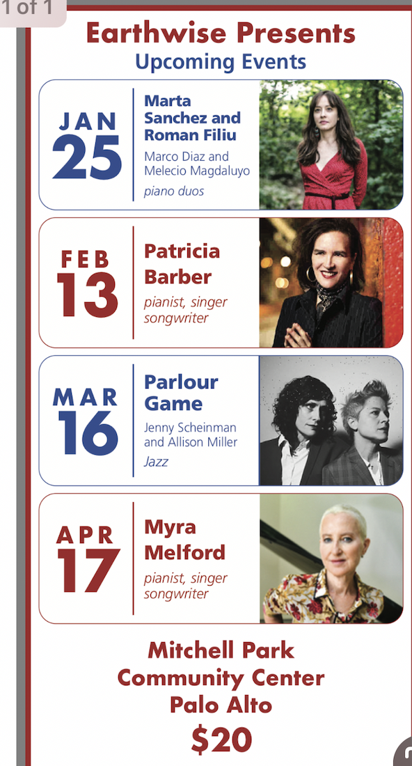 Earthwise has produced several concerts this year at places like Mitchell Park Community Center El Palo Alto Room, Lytton Plaza and Palo Alto Art Center. On the schedule are shows — jazz, folk, rock and classical — at Oshman JCC Palo Alto, Johnson Park and Mitchell Park Bowl — all places Earthwise has showcased in recent years. In the 1990s, Earthwise produced 150 show, roughly twice per month, at the old Cubberley High campus – -chiefly in the theatre and the multi-purpose room / cafeteria / auditorium.