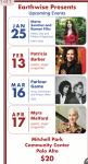 And although its been axiomatic that the Earthwise outdoor shows are free (and the indoors shows either a bargain or free), this show at the Stern courtyard is both outdoors and ticketed — Earthwise uses the ticket revenue to help pay for the outdoor shows.