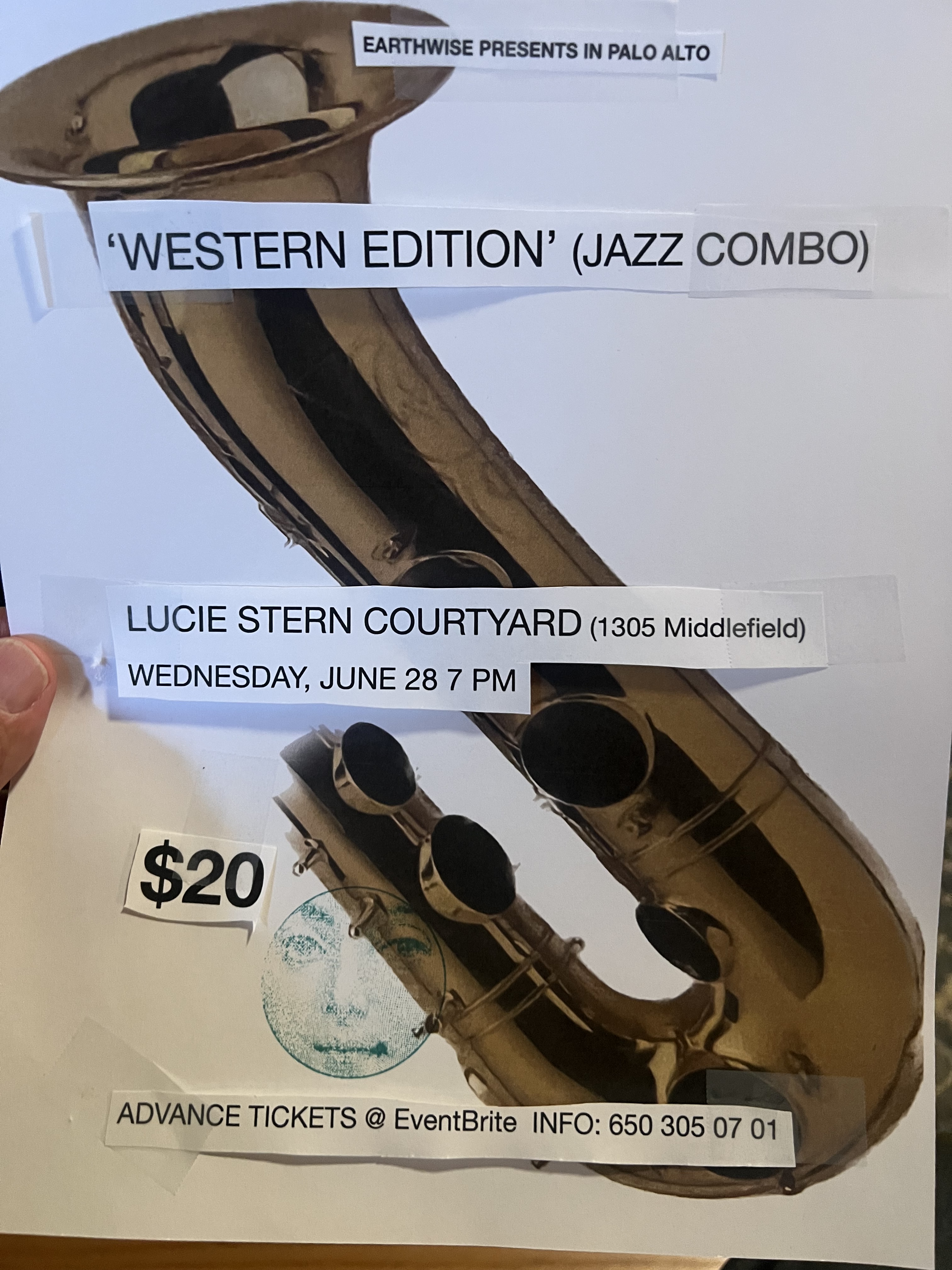 Earthwise Productions of Palo Alto is hosting a jazz concert Wednesday at Lucie Stern Community Center Courtyard featuring the jazz combo known as ‘Western Edition’.