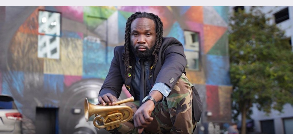 If you can see the photos above you will surmise that the seven events alluded to in the headline comprise Sam Reider with Jorge Glem — accordion and cuatro; Chuck Prophet & Mission Express featuring Stephanie Finch — he on guitar, she on keys; Sam Burton who leads a five piece rock band and is carrying an opener named John Andrews I believe; Shamarr Allen from New Orleans who plays a trumpet and sings — his show also includes Amendola, Garabedian Lubin-Ladin aka SticklerPhonics (not pictured); Dashawn Hickman of Mt. Airy North Carolina who does not actually play an instrument — he just stares and at you makes you think happy thoughts; Lisa Mezzacappa a noted bassist and band leader and side person and composer who is appearing with a side person or bandmate and some films or audio visual, plus there’s a Brazilian duo of Vinicius Gomes guitar and Fabianna Cozza voice; and I think I am adding or. just thinking hard and hoping to materialize here in town Friday from 12 to nearly 1 lunch hour or fifty minutes Caroline Davis sax Jayla Chee bass and Myra Kronfeld who pulls a tiger’s tale the way I am sort of pulling your leg — kind of an Alice Coltrane meets “Bringing Up Baby Thing”.