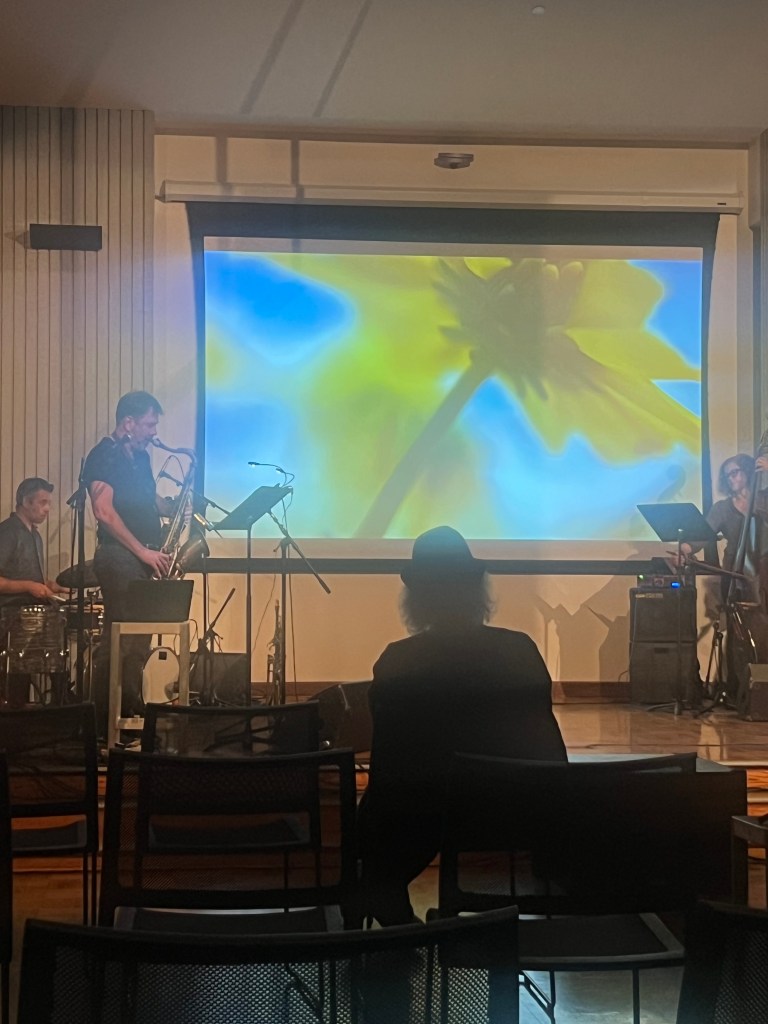Chris Jonas,,reeds; Jason Levis, drums; Lisa Mezzacappa bass; Cory Wright, reeds, at Palo Alto Art Center, by Earthwise Productions October 20, 2023