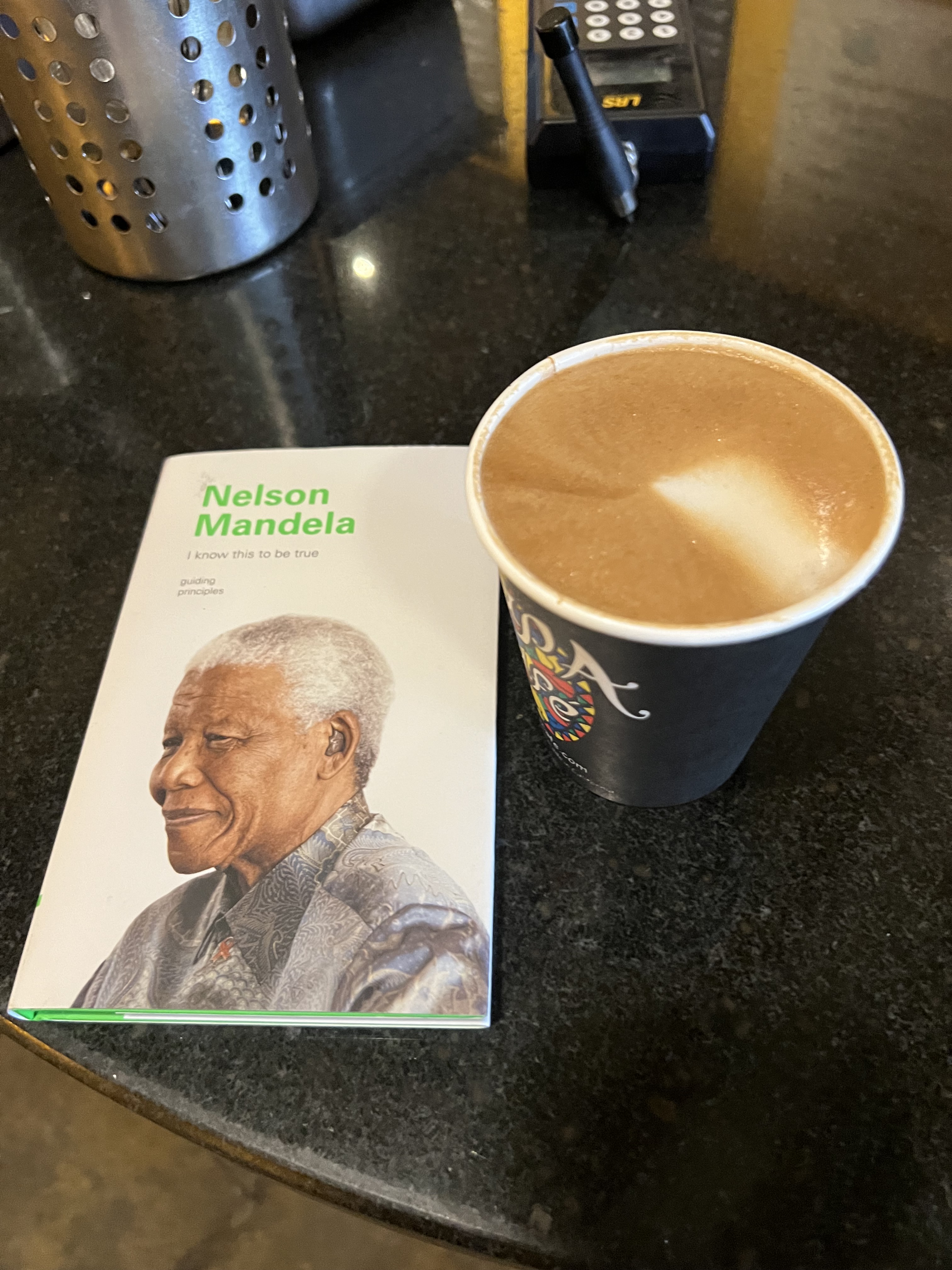 I think I succeeded in not triggering his animus by pulling from my bag a copy of a book about Nelson Mandela I know this to be true Chronicle Books Nelson Mandela Foundation which I bought from Gwen Gasque at Letter Perfect. (Not to be confused with Nelson Mandela Education foundation of Cape Town which is run by my Gunn and Dartmouth schoolmate Kim Porteus who came to my Tuck & Patti show and may or may not accept my invite to hear and see Abdullah Ibrahim next week at SFJazz).