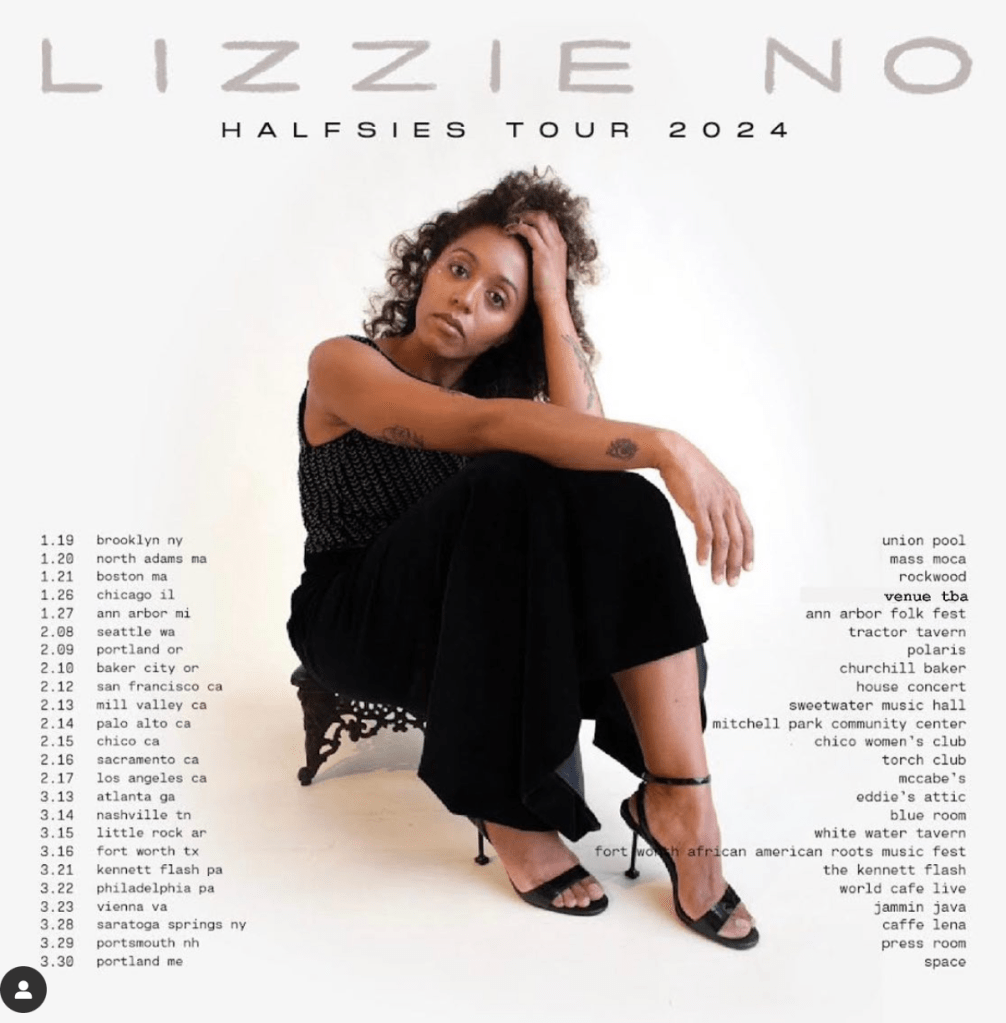 Doing this from memory: Patti Cathcart, with Tuck’s guitar; Rachel Baiman, Roberta Lea, the late great Echo Brown to whom I am trying to produce a tribute; that’s only three I thought there were six; but I want to relate a story about the Harvard grad and retired doctor who drove down from afar last night and is a big fan of….thinking..damn am I sleep deprived…my headliner last night…Lizzie No and she deserves the group of No-heads or what-not and he said he was at my Roberta Lea show but did not remember that also on the bill was Rachel Baiman who is one of only two acts to have played the guild in MP before earthwise whereas there are 10 or more the other direction (Charlie Hunter, Mother Hips, Galactic, Molly Tuttle) and I said I had two female troubadours traveling with their husbands whose paths happened to cross in Palo Alto by Earthwise at Johnson Park. And this was October a week or so after terrorists killed 1,000 people mostly women and many at a music festival in Israel. And in one case Rachel was traveling with George a fellow fiddle player, from New Zealand; but Roberta was traveling with her husband who is also her tour manager; and when I explained to him — his name and number are in my phone but not my head in this instance and I did call him more recently and thank him again or re-ignite or kindle this narrative or my view of it– that as a Jew I am particularly triggered may not have been my word at the time, affected by the massacre and attack. And I gave a basic speech about worst case scenarios and emergency procedures. And he said something to the effect — which has brought up wells of emotion when I re-tell this — “I am a Marine and I am trained to help you in those situations” which he did not have to say but he did and I thank him.