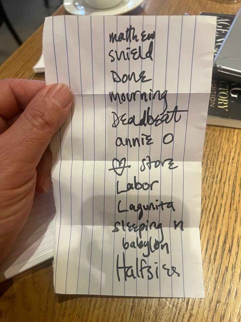 Doing this from memory: Patti Cathcart, with Tuck’s guitar; Rachel Baiman, Roberta Lea, the late great Echo Brown to whom I am trying to produce a tribute; that’s only three I thought there were six; but I want to relate a story about the Harvard grad and retired doctor who drove down from afar last night and is a big fan of….thinking..damn am I sleep deprived…my headliner last night…Lizzie No and she deserves the group of No-heads or what-not and he said he was at my Roberta Lea show but did not remember that also on the bill was Rachel Baiman who is one of only two acts to have played the guild in MP before earthwise whereas there are 10 or more the other direction (Charlie Hunter, Mother Hips, Galactic, Molly Tuttle) and I said I had two female troubadours traveling with their husbands whose paths happened to cross in Palo Alto by Earthwise at Johnson Park. And this was October a week or so after terrorists killed 1,000 people mostly women and many at a music festival in Israel. And in one case Rachel was traveling with George a fellow fiddle player, from New Zealand; but Roberta was traveling with her husband who is also her tour manager; and when I explained to him — his name and number are in my phone but not my head in this instance and I did call him more recently and thank him again or re-ignite or kindle this narrative or my view of it– that as a Jew I am particularly triggered may not have been my word at the time, affected by the massacre and attack. And I gave a basic speech about worst case scenarios and emergency procedures. And he said something to the effect — which has brought up wells of emotion when I re-tell this — “I am a Marine and I am trained to help you in those situations” which he did not have to say but he did and I thank him.