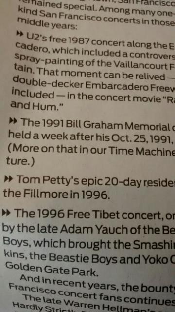 and maybe this does not belong here at all, except in the sub-theme about why I entering “male menopause” or something will bike my way to the edge of an event I am not invited to — this is more about aging that about culture — but I also recalled that last week Peter Hartlaub of the Chronicle had a list of cool concerts over the years and I was going to make my own list. I did not see Tom Petty at the Fillmore but I recall that Bruce Solar Cake’s agent, then with Absolute of SF and not TAG of LA-LA, telling me there was no way to sneak me into the Cake at Slim’s sold out show but would I settle for Tom Petty? As in, Cake was a hotter ticket. Likewise I did not see Tibet show but have the poster (now that Peter Kirkeby is down-sizing, or I bought it at his mother’s garage sale). I did not see U2 at Embarcadero Plaza but recall that Bono sprayed STOP TRAFFIC on a famous sculpture. I did catch every note of the Bill Graham thingy, however, thanks to the AWBY crew I was adjuncted with. (although never heard what a, w, b y means…)
