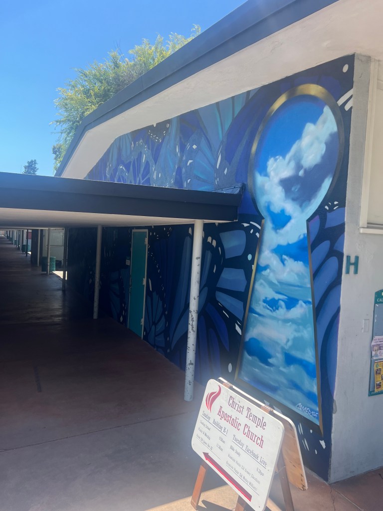 It’s part of our Palo Alto Public Art collection, and spans two quasi-linked surfaces, the U Building which hosts some artist studios and H, especially H-1 a meeting space where Ron Jones’ infamous “Wave” project took place. The mural is considered “temporary” which I reckon means the artist waived his rights to sue us when the wrecking ball finally comes.